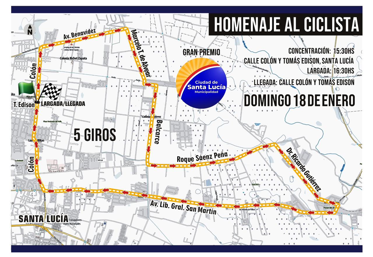 El departamento de Santa Lucía se prepara para recibir el Gran Premio «Homenaje al Ciclista», una competencia que tendrá lugar el próximo domingo 18 de enero. El evento, organizado con el auspicio de la Municipalidad de Santa Lucía, promete una jornada de gran despliegue deportivo en un circuito que recorrerá arterias principales del departamento.